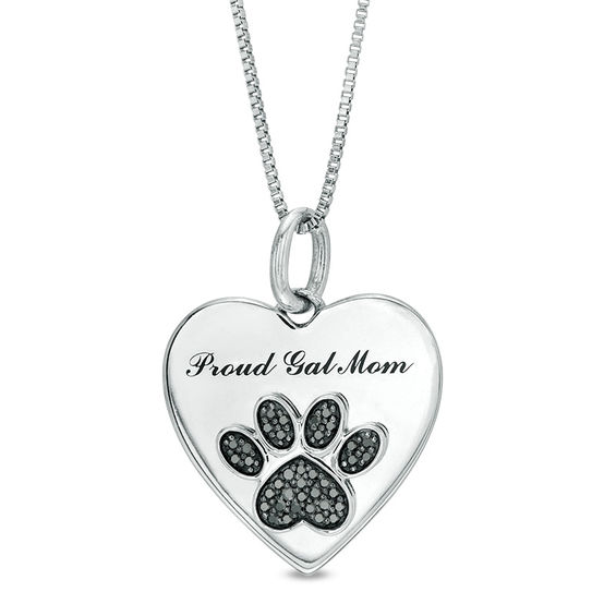 Designed for the best caregiver, this heart-shaped diamond paw pendant is a look she’ll wear with love. Crafted in sterling silver, this footprint style features a heart-shaped pad and is lined with alluring enhanced black diamonds. Engraved with the words “Proud Cat Mom;” this petite choice is destined to be treasured. Radiant with 0.09 ct. t.w. of diamonds and a brilliant buffed lustre, this pendant suspends along a 16.0-inch cable chain with 2.0-inch extender that secures with a lobster claw clasp.