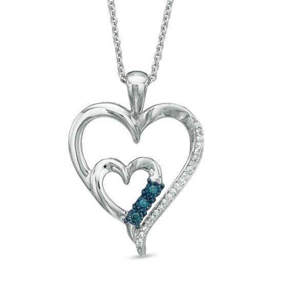 Bright and colourful, let this darling diamond double heart pendant be the metaphor for your romantic love story. Crafted in sleek sterling silver, this design features an outer heart adorned with shimmering white diamonds wrapping a smaller heart decorated with enhanced blue diamonds in a sparkling embrace. A lovely look, these hearts captivate with 0.09 ct. t.w. of diamonds and a polished shine. The pendant suspends along an 18.0-inch cable chain that secures with a lobster claw clasp.