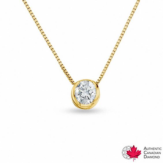 A modern look for the sophisticated woman, this diamond pendant will dazzle and delight her. Bezel-set in 10K white gold, this 0.10 ct. round-cut certified Canadian diamond sparkles brightly. The diamond boasts a colour ranking of I with a clarity of I2 – an exceptional stone. The look suspends from an 18.0-inch box chain and secures with a spring-ring clasp. Certified Canadian diamonds are accompanied with a Certificate of Authenticity.
