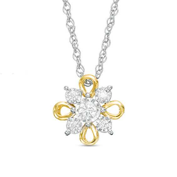A darling addition to her attire, this dainty diamond pendant shimmers with floral touches. Crafted in 10K two-toned gold, this charming design features a 0.06 ct. diamond centre stone in white gold, artfully set to enhance size and sparkle. Additional diamonds create four corners of glimmer. In-between, four open-loop petals of yellow gold complete the style. Radiant with 0.10 ct. t.w. of diamonds and a bright polished shine, this pendant suspends along an 18.0-inch rope chain that secures with a spring-ring clasp.