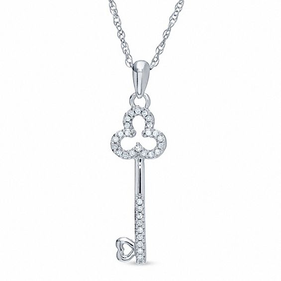 Her deepest secrets and most treasured thoughts are locked away with this glittering key pendant. Elegantly crafted of sterling silver, the mini clover key design is brightened by round diamond accents totalling 0.10 ct. Grace her neck with this beauty. The pendant suspends close to her heart from a rope chain 18.0 inches in length.