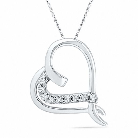Graceful and elegant, this diamond heart pendant says exactly what you feel. Fashioned in cool 10K white gold, this swirling heart is adorned with a sparkling ribbon of shimmering diamonds that adds eye-catching appeal. Radiant with 0.10 ct. t.w. of diamonds and a polished shine, this heart suspends close to hers along an 18.0-inch rope chain that secures with a spring-ring clasp.