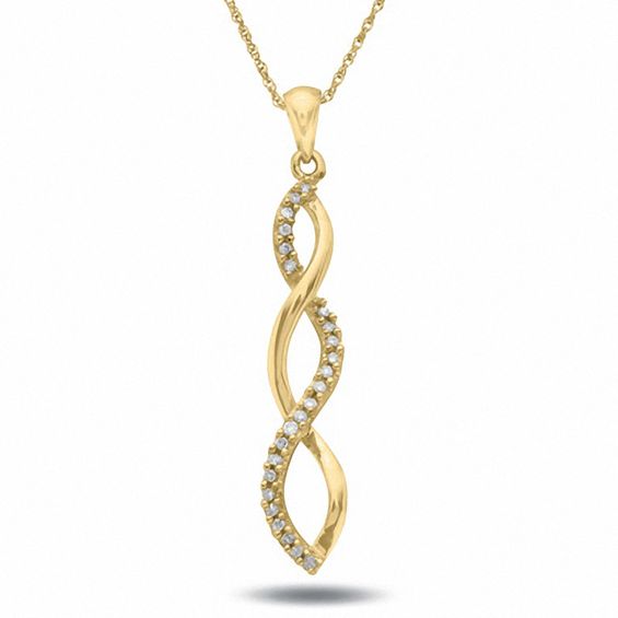 Curved lines of 10K gold overlap and twine around each other like sparkling strands of ribbon, forming a graceful, symmetrical pendant. With one half polished, one half set with diamonds totalling 0.10 ct., the spiral glints and dance with each step you take. The pendant hangs on an 18.0-inch rope chain with spring-ring clasp.