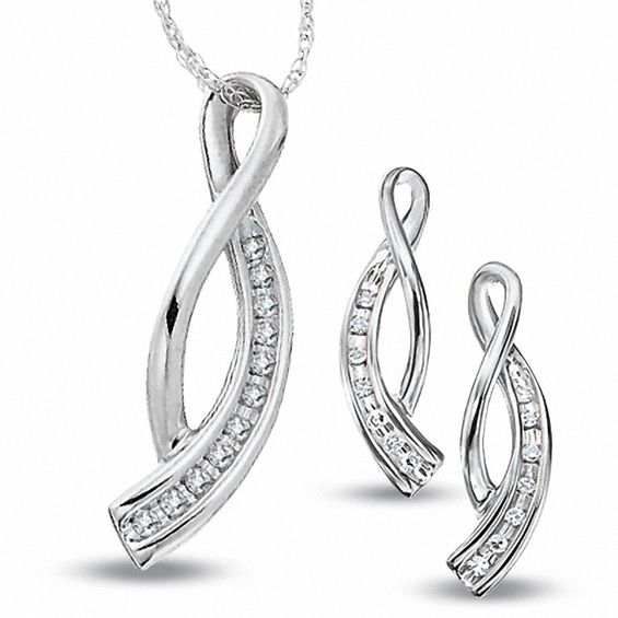 Take her breath away with a matching set of ribbon-twist earrings and pendant. Set in 10K white gold, the pendant and stud-backed earrings feature delicate curves and round diamond accents totalling 0.10 ct. Graduated diamonds represent the steps on your journey through life together, each stone larger than the one before it to symbolize the growth of your love over time. The pendant hangs on an 18.0 inch rope chain with a spring-ring clasp. Journey Diamond Jewellery is designed to celebrate love. Graduated stones represent how love grows stronger over time.