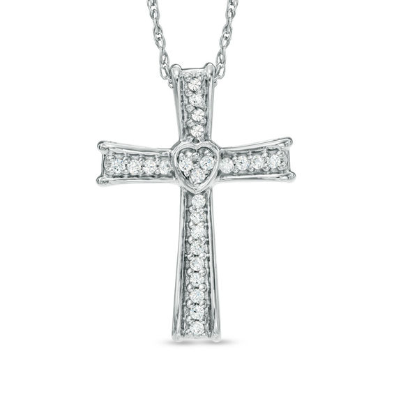 Faith, love and fashion all represent in this delightful cross pendant. Crafted in sleek sterling silver, this flare-edged cross is lined with shimmering diamonds. At the centre of the style, a heart-shaped frame sparkles with a trio of diamonds, completing the look. Radiant with 0.12 ct. t.w. of diamonds and a bright polished shine, this enchanting cross suspends along an 18.0-inch rope chain.