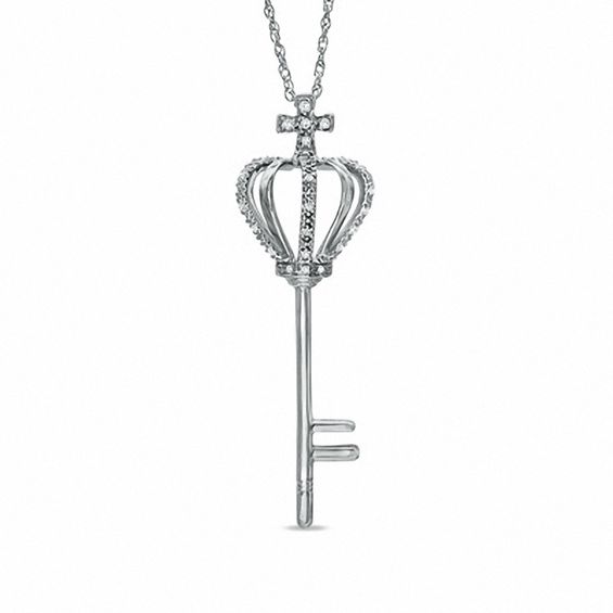 A royal look for the most regal of women, this pendant will make her feel like a queen! Fashioned in fine sterling silver, this charming key features a crown-shaped bow topped with a cross and dazzling with 0.12 ct. of shimmering diamonds. A majestic look, the key suspends from an 18.0-inch rope chain.