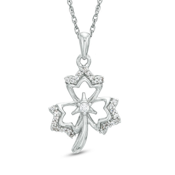 A fabulous autumnal emblem, this diamond maple leaf pendant is a lovely look any time of year. Created in 10K white gold, this maple leaf is centred with a single shimmering diamond, while the leaf itself is bordered with smaller accent diamonds. Radiant with 0.13 ct. t.w. of diamonds and polished to a brilliant shine, this leaf-shaped pendant glides freely along an 18.0-inch rope chain that secures with a spring-ring clasp.