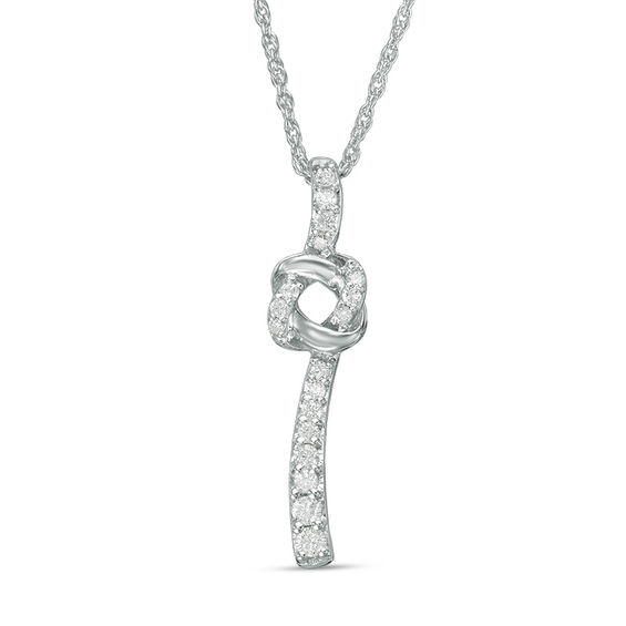 For a modern twist, add this stylish diamond knot pendant to your attire. Fashioned in sterling silver, this intriguing design features a long diamond-lined ribbon sweetly knotted to show both shimmering and polished finishes. Sparkling with 0.145 ct. t.w. of diamonds and a brilliant buffed lustre, this sleek pendant suspends along an 18.0-inch rope chain that secures with a spring-ring clasp.