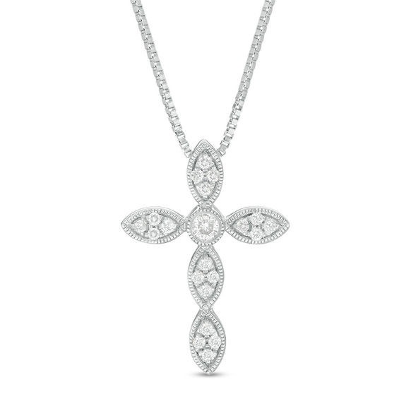 A thoughtful choice, this vintage-inspired diamond cross is a beautiful addition to her wardrobe. Crafted in sterling silver, this heirloom look features a sparkling 0.04 ct. diamond at its centre, wrapped in a milgrain frame. Milgrain-detailed marquise-shaped frames of diamond quartets create the arms. Radiant with 0.145 ct. t.w. of diamonds and a brilliant buffed lustre, this keepsake pendant suspends along an 18.0-inch box chain that secures with a lobster claw clasp.