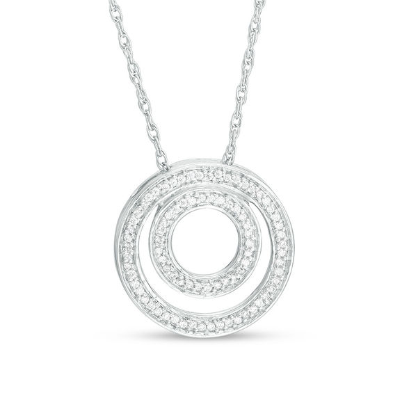 So pretty, this dazzling diamond double-circle pendant elevates your attire. Crafted in sterling silver, this sparkling style features a smaller diamond-lined ring inside a larger one. Radiant with 0.15 ct. t.w. of diamonds and a brilliant buffed lustre, this pendant suspends along an 18.0-inch rope chain that secures with a spring-ring clasp.