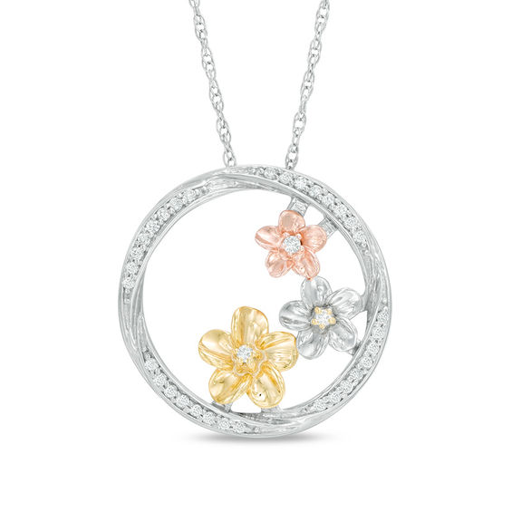 Treat her to a glistening diamond pendant that speaks to her feminine style. Created in sterling silver with 10K two-toned gold, this dramatic design features an open swirling circle frame lined with sparkling diamonds. Inside, a trio of precious and pretty diamond-centred pinwheel posies – one in rose gold, one in yellow gold, and one in silver – lends interest to this enchanting look. Delightful with 0.18 ct. t.w. of diamonds and a bright polished shine, this pendant suspends along an 18.0-inch rope chain that secures with a spring-ring clasp.