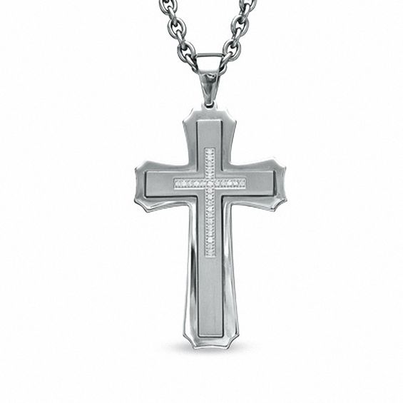 Striking in stainless steel, this stylish men’s cross pendant is a thoughtful expression of his personal beliefs. The flared outer cross in silver-tone is topped with a traditional cross in deep grey. At the centre, a cross of sparkling round diamonds totalling 0.24 ct. gives the look a hint of shimmer. Polished to a bright shine, the look suspends from a 3.0mm, 24.0-inch rolo chain and secures with a lobster claw clasp.