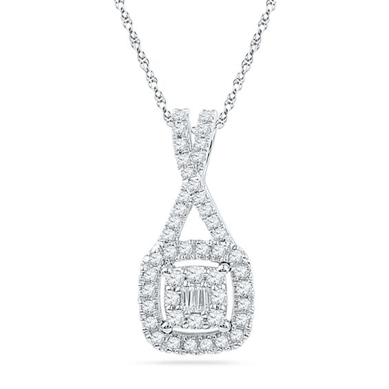 Treat the one you love to this exquisite diamond drop pendant. Fashioned in cool 10K white gold, the eye is drawn to the duo of baguette-cut diamonds at the centre. A double cushion-shaped frame surrounds this centre cluster, while the gracefully twisting, diamond-lined bale is a thoughtful touch. Glistening with 0.25 ct. t.w. of diamonds and a polished shine, this pendant suspends along an 18.0-inch rope chain that secures with a spring-ring clasp.