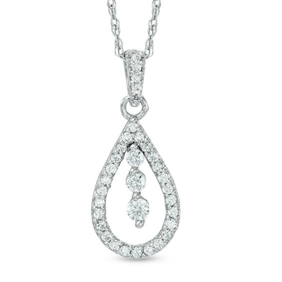 Dressed up or dressed down, this pendant elevates any attire. Fashioned in 10K white gold, this teardrop-shaped pendant is completely outlined with shimmering diamonds. A linear drop set with three glittering diamonds centres the style, while the diamond-lined bale completes the look. Radiant with 0.25 ct. t.w. of diamonds and a bright polished shine, this pendant suspends along an 18.0-inch rope chain.