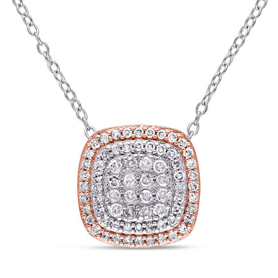A charming addition to her day or evening wardrobe, this dainty diamond pendant really sparkles. Crafted in two-toned sterling silver, this petite drop features a cushion-shaped composite of shimmering diamonds and a diamond border in sterling, wrapped in an outer frame of diamonds in rose rhodium. Eye-catching with 0.47 ct. t.w. of diamonds and a brilliant buffed lustre, this pendant suspends along an 18.0-inch cable chain that secures with a spring-ring clasp.