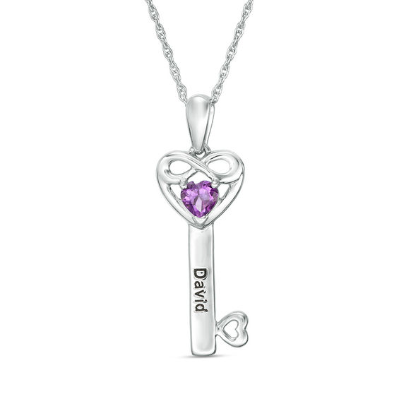 Give her a sweet surprise with this Personalized heart key pendant. Fashioned in sterling silver, this endearing style features the 4.0mm heart-shaped simulated birthstone you select beneath a looping infinity-symbol shape – all wrapped in a polished heart-shaped bow. Further customize this design with the corresponding name – up to six characters in length – inscribed in a print font along the shaft. A cute heart-shaped bit completes the look. Buffed to a brilliant luster, this pendant suspends along an 18.0-inch rope chain that secures with a spring-ring clasp.