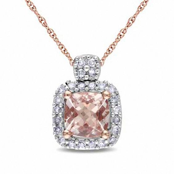 Express your love with this glistening morganite and diamond pendant. Beautifully crafted in warm 10K rose gold, this pendant showcases a 5.0mm cushion-cut pale pink morganite. A border of shimmering round diamonds wraps this centre stone in a sparkling embrace, while the diamond-lined bale is a thoughtful touch. Radiant with 0.10 ct. t.w. of diamonds and finished with a bright polish, this heart suspends close to hers along a 17.0-inch rope chain that secures with a spring-ring clasp.