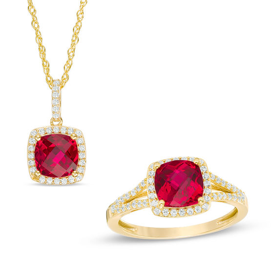 Treat her to the stunning sparkle and decadent look of this glamorous fashion pendant and ring set. Crafted in warm 10K gold, each piece features a 7.0mm cushion-cut lab-created bright red ruby in a dazzling wraparound frame of shimmering lab-created white sapphires. A dainty linear bail lined with sapphires tops the pendant, while slender rows of sapphires decorate the coordinating ring’s split shank. The pendant suspends along an 18.0-inch rope chain that secures with a spring-ring clasp. So thoughtful, this two-piece ensemble is buffed to a brilliant lustre. This set arrives beautifully boxed and ready for giving.