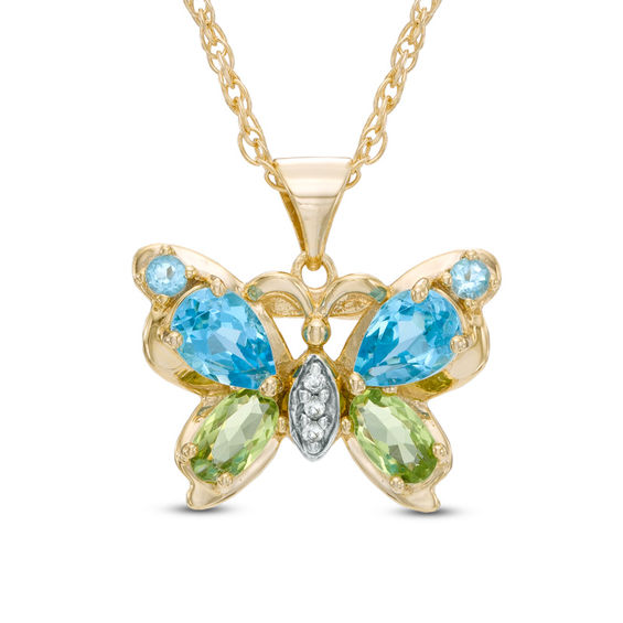 Mother nature herself would envy the glimmer and colour of this butterfly fashion pendant. Crafted in sterling silver with warm 14K gold plate, this enchanting design features wings of multi-shaped sky blue topaz and spring-green peridot. Sparking lab-created white sapphires line the butterfly’s body, providing extra sparkle. Destined to become a jewellery box favourite, this precious papillon is polished to a brilliant shine and suspends along an 18.0-inch rope chain that secures with a spring-ring clasp.