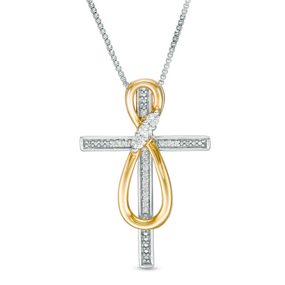 Vary your look of faith with the versatility of this sparkling diamond cross pendant from the Convertibilities Collection. Crafted in sterling silver and warm 10K gold, this three-in-one choice showcases a cross and infinity symbol that may be worn separately or fitted together – offering you a trio of great styles. The cross is diamond-lined and beaded, while the infinity symbol shape features a trio of diagonally set diamonds at its centre. Combined, they create a seamless design. Radiant with 0.13 ct. t.w. of diamonds and a brilliant buffed lustre, this two-part drop suspends along one 18.0-inch box chain (with an easy-to-thread end) that secures with a lobster claw clasp.