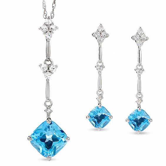 For the woman who enjoys feminine beauty, this 14K white gold pendant and earring set mixes vibrant blue with everything sparkly. Round white topazes and diamond accents dangle toward a cushion-cut, kite-shaped blue topaz at the bottom of each piece. The earrings close with friction backs, and the pendant’s 18.0-inch rope chain closes with a spring-ring clasp. Surprise a December-born with the beautiful gift of her lovely birthstone, blue topaz, and watch her be simply enchanted.