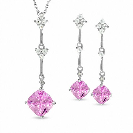 For the woman who enjoys feminine beauty, this 14K white gold pendant and earring set mixes sweet pink with everything sparkly. Round white topazes and diamond accents dangle toward a cushion-cut, kite-shaped pink sapphire at the bottom of each piece. The earrings close with friction backs, and the pendant’s 18.0-inch rope chain closes with a spring-ring clasp. For a twist on her usual blue birthstone, surprise her with pink sapphires in September.