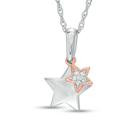 With double the stellar charm, this inspiring pendant is a dreamy choice she wonât be able to resist. Fashioned in sterling silver and precious 10K rose gold, this divine look features a polished sculpted star. Diamond accents twinkling inside a petite star-shaped charm in rose gold lend sparkle to the design. Buffed to a brilliant lustre, this pendant suspends along an 18.0-inch rope chain that secures with a spring-ring clasp.