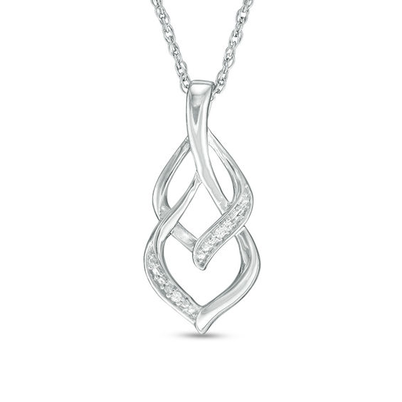 Surprise her with the shape and shimmer of this graceful fashion pendant. Crafted in sterling silver, this intertwined drop features two open flame shapes touched with diamond accents. Buffed to a brilliant lustre, this pendant suspends along an 18.0-inch rope chain that secures with a spring-ring clasp.