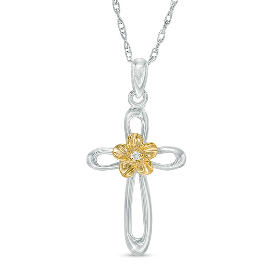 Precious and pretty, this cross pendant is a fashion-forward symbol of her faith. Crafted in sterling silver, this open-loop cross is centred with a bright 10K gold flower accented with a sparkling diamond. Buffed to a brilliant lustre, this pendant suspends along an 18.0-inch rope chain that secures with a spring-ring clasp.