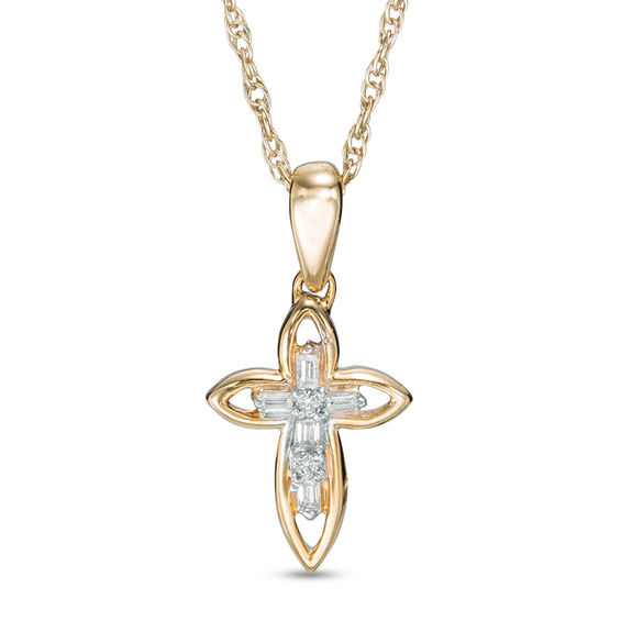 Celebrate her faith with this feminine diamond cross pendant. Created in warm 10K gold, this dainty design features a cross of sparkling baguette-cut diamond accents outlined with a stylized polished cross border. Buffed to a brilliant lustre, this cross suspends along an 18.0-inch rope chain that secures with a spring-ring clasp.