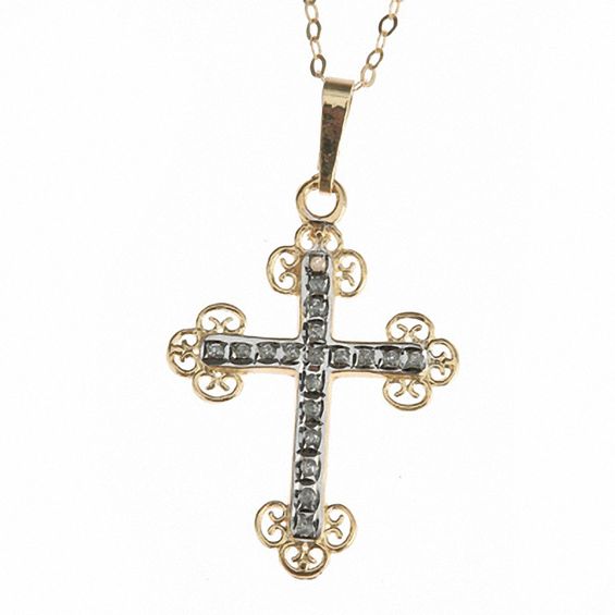 Honour your faith and treat yourself to shine with this Diamond Fascination cross pendant. In eye-catching 14K gold, the design shimmers with one diamond accent followed by a diamond enamel bead design. Enjoy this beautiful and religious look anywhere as it suspends from a rope chain 18.0 inches in length with a spring-ring clasp. Diamond Fascination is a patent handmade process which crystallizes diamond dust into enamel to simulate round cut diamonds.