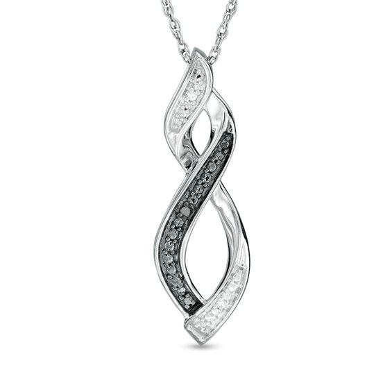Add interest to any outfit with this swirling and sparkling pendant. Crafted in cool sterling silver, this flame-shaped twist design features a pair of white diamond accents and an enhanced black diamond accent along the beaded and dark rhodium-plated ribbons. Polished to a bright shine, this pendant suspends along an 18.0-inch rope chain that secures with a spring-ring clasp.