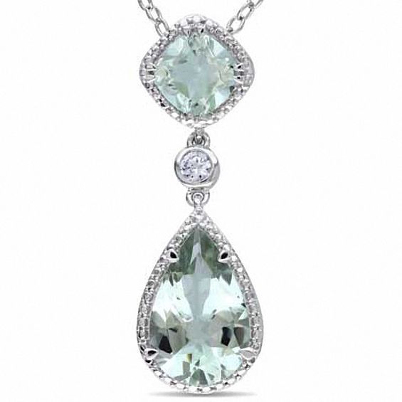 Radiant and eye-catching, this drop pendant is an elegant look for any occasion. Fashioned in sleek sterling silver, this pendant features a bale that holds a brilliant cushion-cut green quartz framed with a border of polished beading and shimmering lab-created white sapphires. The bale supports a larger elegant pear-shaped drop that follows the same enchanting pattern, while a single bezel-set lab-created white sapphire centres the style. Polished to a brilliant shine, this pendant suspends along an 18.0-inch cable chain that secures with a spring-ring clasp.