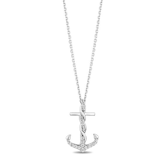 With sea-worthy style, this diamond pendant from Moments by Hallmark Diamonds honouring Inspiration captures her imaginative spirit. Fashioned in sterling silver, this eye-catching choice showcases a sculpted anchor shimmering with diamonds. Polished details and an entwined ribbon – a reminder of cherished connections and significant moments – lend depth to the look. This piece comes imprinted with the Hallmark Crown, an iconic and trusted symbol in celebrating special occasions. Captivating with 0.14 ct. t.w. of diamonds and a brilliant buffed lustre, this pendant suspends along an 18.0-inch cable chain with an additional closure ring at 16.0 inches that secures with a lobster claw clasp. Moments by Hallmark Diamonds is exclusively ours. ©HMK. LIC.