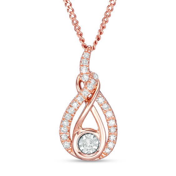 Celebrate your special connection with the easy embrace of this diamond pendant from the Interwoven™ Collection. This touching piece showcases intertwining strands that represent two lives – and two distinct stories – as they blend together and become one. Crafted in precious 10K rose gold, this dazzling reflection of your unique bond features a polished design wrapped in a shimmering diamond-lined twist frame. At its base, a single diamond – artfully set to enhance size and sparkle – signifies your unity and your relationship as a couple. Radiant with 0.09 ct. t.w. of diamonds and a brilliant buffed lustre, this pendant suspends along a 17.0-inch curb chain with 2.0-inch extender that secures with a lobster claw clasp.