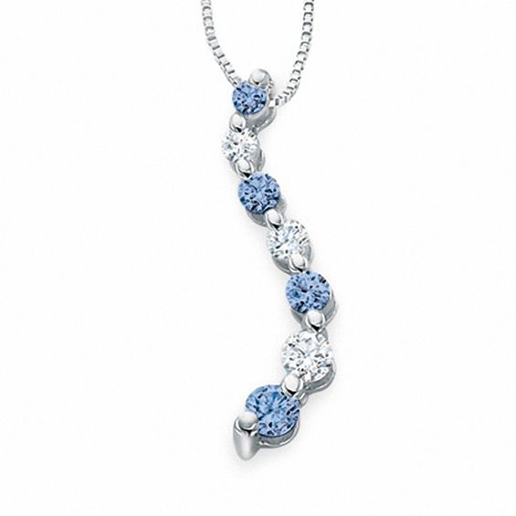 Celebrate your love with a pendant reflecting impeccable taste. Set within 10K white gold, the graduated descending gemstones in this pendant symbolize how love grows stronger over time, each stone larger than the one that came before it. Clear, crisp lab-created white sapphire combines with the sweet, charming blue of lab-created Ceylon sapphire in an exceptional display of sophisticated beauty. This pendant hangs on an 18.0-inch rope chain with spring-ring clasp. Journey Gemstone Jewellery is designed to celebrate love. Graduated stones represent how love grows stronger over time.