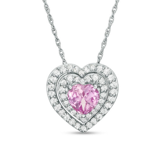 With a variety of style options, this adorable two-piece heart pendant is sure to be an instant favourite. Crafted in sterling silver, this endearing choice showcases a 6.0mm heart-shaped lab-created bright pink sapphire wrapped in a frame of shimmering lab-created white sapphires. A separate heart outline sparkles with petite created white sapphires. Wear these pieces separately or bring them together for a dazzling look. Buffed to a brilliant lustre, this pendant suspends along an 18.0-inch rope chain that secures with a spring-ring clasp.