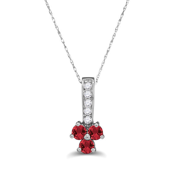 Honour her July birthday with this dainty and colourful pendant. Crafted in sterling silver, this tasteful drop features a trio of 3.5mm lab-created bright red rubies topped with a sparkling diamond-adorned linear bail. Radiant with 0.12 ct. t.w. of diamonds and a brilliant buffed lustre, this pendant suspends along an 18.0-inch cable chain that secures with a spring-ring clasp.
