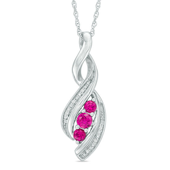 On her July birthday, treat the woman you love to this sparkling swirl pendant. Crafted in sterling silver, this three-stone style highlights a trio of lab-created bright red rubies – the largest 3.8mm in size – nestled inside a cascading ribbon lined with dazzling diamond accents. Buffed to a brilliant lustre, this whimsical choice suspends along an 18.0-inch rope chain that secures with a spring-ring clasp.