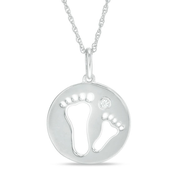 Treat the new mom to this adorable disc pendant. Crafted in cool 10K white gold, this sweet style features two footprint cutouts – a larger for mom and a smaller representing baby – and a petite bezel-set lab-created white sapphire. Polished to a bright shine, this pendant suspends along an 18.0-inch rope chain that secures with a spring-ring clasp.