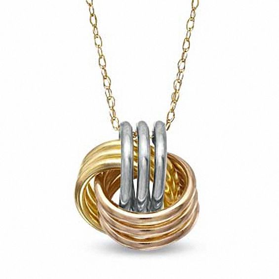 Elevate your every day attire with this eye-catching tri-colour fashion pendant. Crafted in 10K gold, this neatly knotted design knits together rose, white and yellow gold in a clever looping design. Buffed to a brilliant shine, this pendant suspends freely along an 18.0-inch rope chain that secures with a spring-ring clasp.
