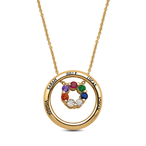 The family circle can never be broken – honour this immense bond with the statement look of this Personalized pendant. Crafted in your choice of silver or gold, this open design highlights a small circular arrangement of the one to seven birthstones you select (a white stone will be placed where no birthstone is chosen). A large polished circle outline featuring up to seven corresponding family names – each up to eight characters each in length, engraved in a bold uppercase block font – completes this day-to-evening style. Buffed to a brilliant luster, this eye-catching pendant suspends along a cable chain that secures with a spring-ring clasp.