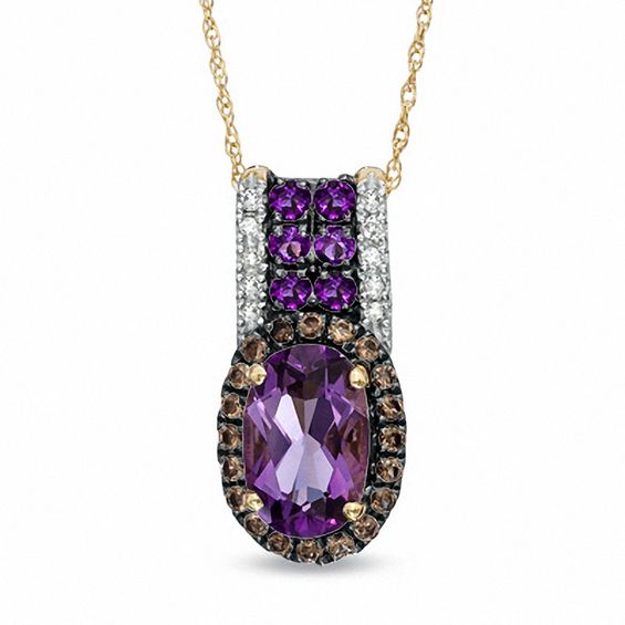 Captivating and so colourful, this pendant is a celebration of her February birthday. Crafted in warm 10K gold, the pendant showcases a regal 9.0 x 6.0mm oval-shaped bright purple amethyst centre stone. A frame of rich smoky quartz wraps this gemstone in a sparkling embrace, while glistening diamond accents and additional round amethyst line the pendant’s bale. Polished to a brilliant shine, this pendant suspends along an 18.0-inch rope chain that secures with a spring-ring clasp.