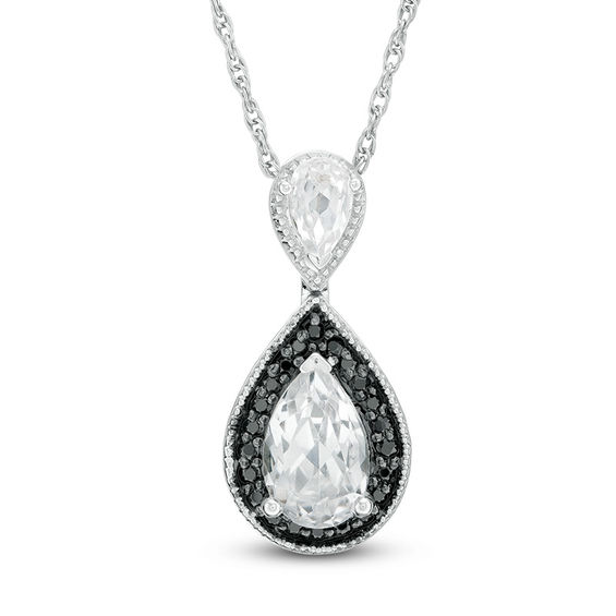 With vintage-inspired design, this sparkling fashion pendant is a beautiful complement to her dressy attire. Crafted in sterling silver, this elegant choice showcases an 8.0 x 5.0mm pear-shaped lab-created shimmering white sapphire dangle wrapped in intricate milgrain detailing and a frame of alluring enhanced black diamonds. The bail glistens with a 5.0 x 3.0mm created white sapphire surrounded in a milgrain-lined border. Captivating with 0.085 ct. t.w. of diamonds and a bright polished shine, this pendant suspends along an 18.0-inch rope chain that secures with a spring-ring clasp.