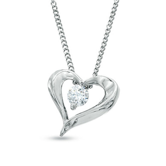 Express your love with this meaningful diamond heart pendant. Fashioned in 14K white gold, this looping open heart is centred with a shimmering stunning 0.10 ct. Canadian diamond solitaire, boasting a colour rank of I and clarity of I2. Buffed to a brilliant shine, this heart suspends close to hers along a 17.0-inch curb chain that secures with a spring-ring clasp.