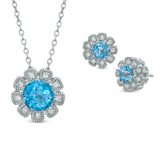 Fashioned in sterling silver, this set includes a pendant that features a 7.0mm round Swiss blue topaz and lab-created white sapphires. The cable chain measures 18.0 inches in length and secures with a spring-ring clasp. The matching stud earrings feature 5.0mm round Swiss blue topaz and lab-created white sapphires. The earrings secure with friction backs.
