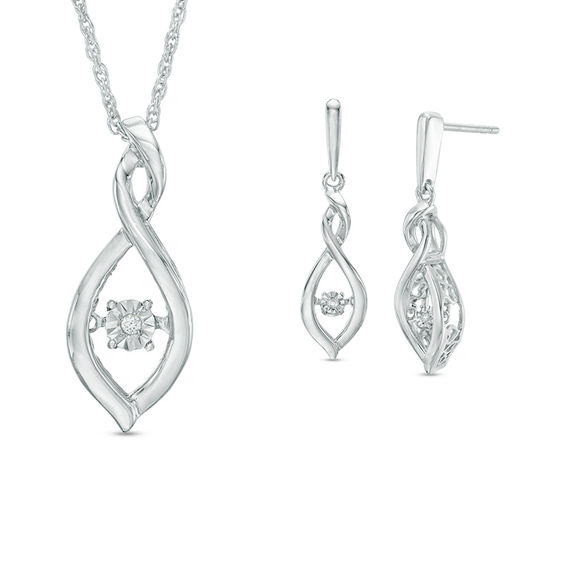 Celebrate your changing, growing and evolving romance with this exquisite pendant and earrings set from the Unstoppable Love™ Collection. Fashioned in sleek sterling silver, the pendant features a twisting infinity symbol-shaped design. At its centre, a single diamond accent glistens in a unique setting that moves with every beat of her heart and every turn of her head. The pendant suspends along an 18.0-inch rope chain that secures with a spring-ring clasp. The coordinating drop earrings dangle from polished linear posts and secure comfortably with friction backs. Buffed to a brilliant lustre, this chic ensemble is certain to be adored. This set arrives beautifully boxed and ready for giving.