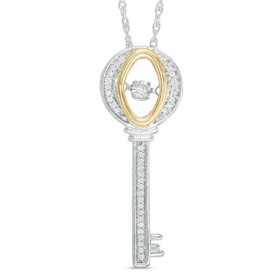 Unlock her heart with this shimmering diamond key pendant from the Unstoppable Love™ Collection. Crafted in sterling silver, this sparkling design features a diamond-lined bow and stem. Inside the bow, a 10K gold oval holds a single diamond in a unique setting that moves with every beat of her heart and every turn of her head. Radiant with 0.12 ct. t.w. of diamonds and a brilliant buffed lustre, this pendant suspends along an 18.0-inch rope chain that secures with a spring-ring clasp.