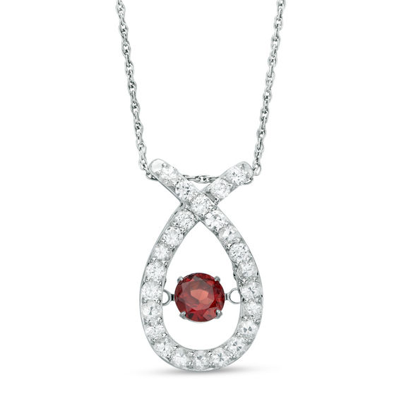 Celebrate your growing and evolving romance with this gemstone pendant from the Unstoppable Love™ Collection. Crafted in sterling silver, this pretty ribbon design features a frame of lab-created white sapphires. Inside, a 5.7mm regal red garnet glistens in a unique setting that moves with every beat of her heart and every turn of her head. Certain to be adored, this pendant suspends along an 18.0-inch rope chain that secures with a spring-ring clasp.