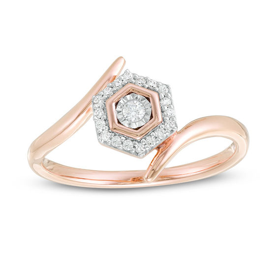 With contemporary style, this diamond promise ring is a chic reminder of your affection. Crafted in precious 10K rose gold, this smart choice features a petite diamond – artfully set to enhance size and sparkle – wrapped in a hexagon-shaped border and diamond-lined frame. Bypassing ribbons curve around the centre for an intriguing look. Captivating with 0.085 ct. t.w. of diamonds and a bright polished shine, this ring suits her unique taste.